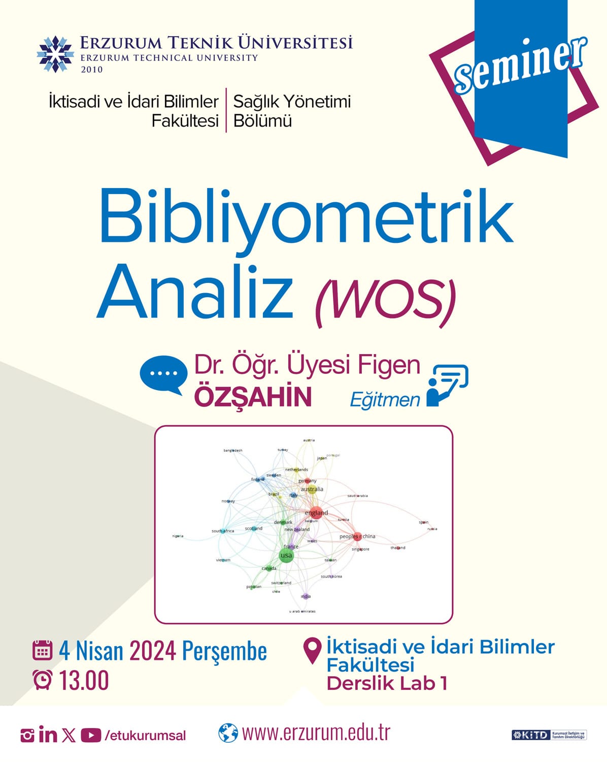 04.04.2024 Perşembe günü saat 13.00'te, hizmet içi eğitim kapsamında, Sağlık Yönetimi Bölümü Bölüm Başkan Yardımcısı Dr. Öğr. Üyesi Figen ÖZŞAHİN tarafından fakültemiz LAB-1 laboratuvarında Bibliyometrik Analiz Eğitimi verilecektir.