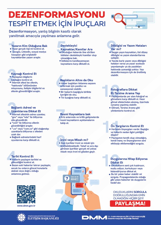 Dijitalleşmeyle birlikte bilgi ekosisteminde yaşanan hızlı değişim ve dönüşüm pek çok faydanın yanı sıra yanlış bilginin üretimi ve hızla yayılması gibi olumsuzlukları da beraberinde getirmiş, dezenformasyon yıkıcı etkileriyle toplumları tehdit eden risklerden biri haline gelmiştir. Toplumsal farkındalık dezenformayonla mücadelenin en önemli sac ayaklarından biridir. Bu kapsamda İletişim Başkanlığınca, “Dezenformasyonu Tespit Etmek için İpuçları” başlıklı afiş çalışması yapılmış olup, bu çalışmada bireylerin maruz kaldıkları yanlış ve yanıltıcı bilgileri tespit etmeleri için yol gösterici ve uyarıcı bilgilere yer verilmiştir.