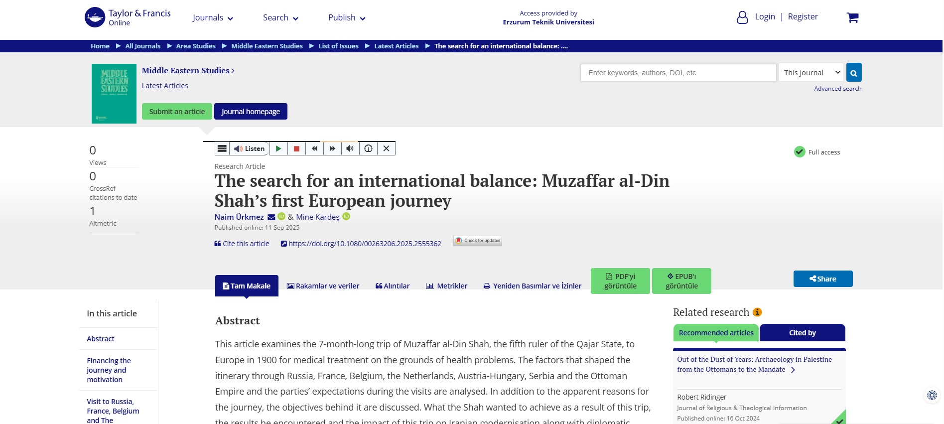 Enstitümüz mezun öğrencisi Mine KARDEŞ ve Prof. Dr. Naim ÜRKMEZ'in "The search for an international balance: Muzaffar al-Din Shah’s first European journey" adlı ortak makalesi SSCI dizinli "Middle Eastern Studies" dergisinde yayınlanmıştır.