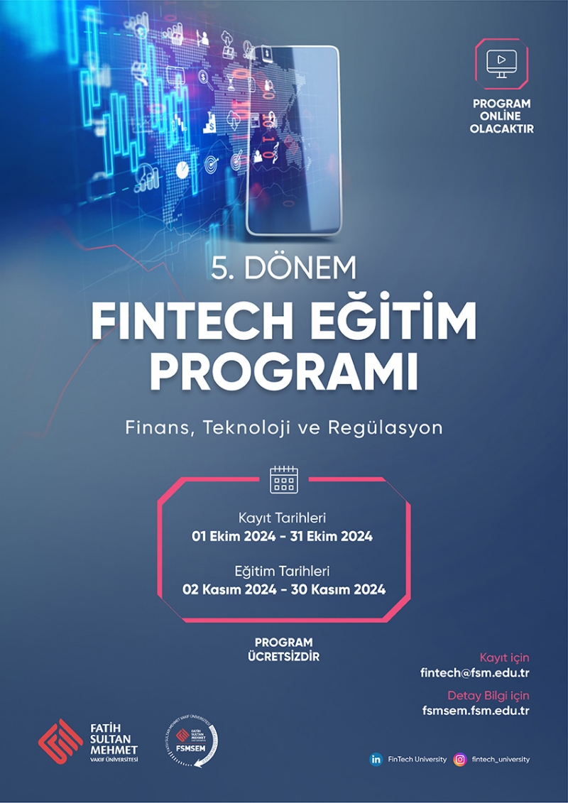 Eğitim Hakkında: Fatih Sultan Mehmet Vakıf Üniversitesi tarafından düzenlenen ücretsiz FinTech eğitimine fakültemiz 3. ve 4. sınıfta öğrenim gören öğrencilerimiz kayıt yaptırabilir. Kayıtlar 31 Ekim 2024 tarihinde sonlanacak olup başvurular başlamıştır. FinTech eğitimine kabul edilecek öğrenci sayısı sınırlıdır. Eğitimler online olarak verilecektir.