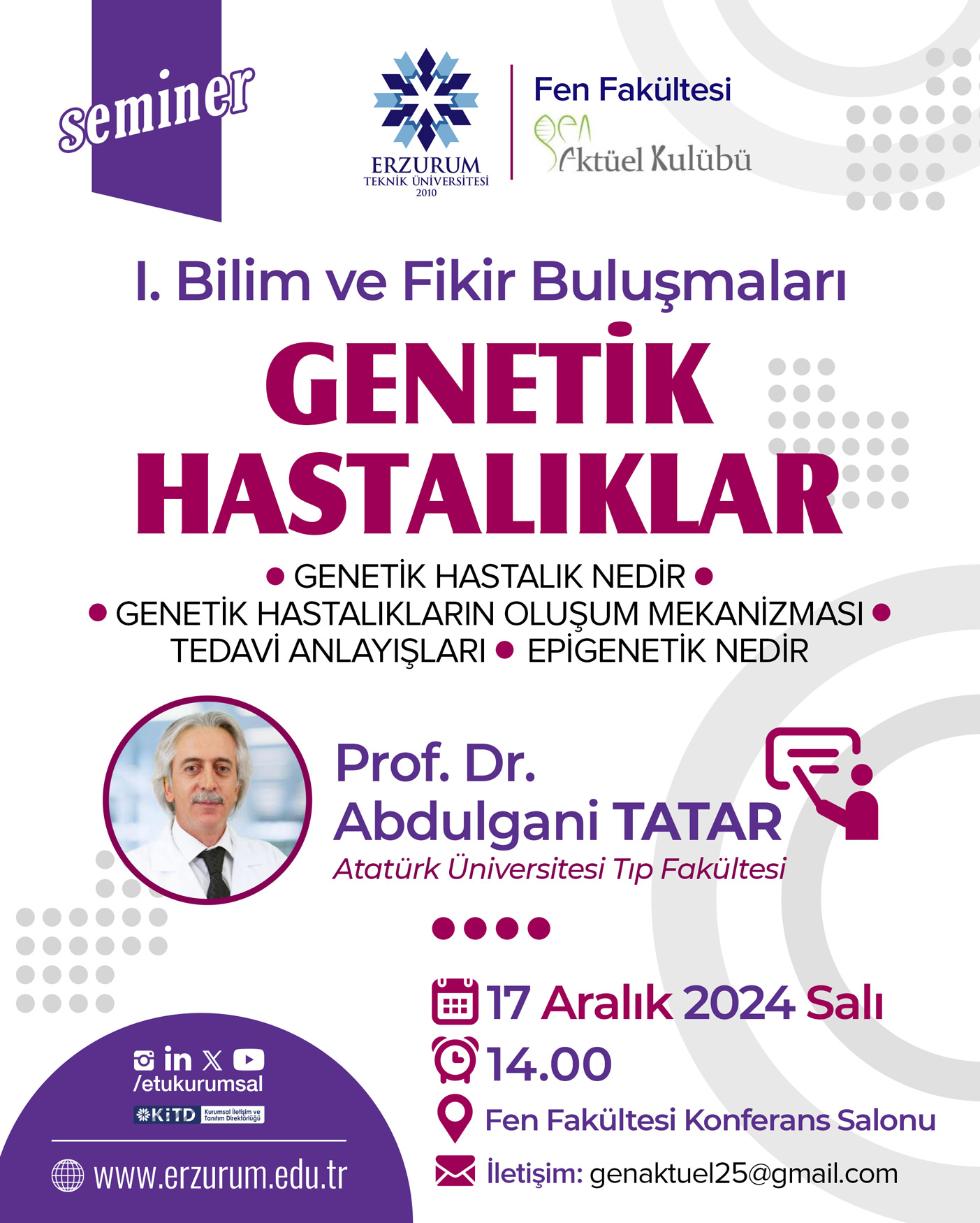 Fakültemiz bünyesinde faaliyet gösteren GENAKTÜEL Kulübü tarafından 09.12.2024 Salı günü saat 14:00'da Fakültemiz Konferans Salonunda "I. Bilim ve Fikir Buluşmaları" programı kapsamında Prof. Dr. Gani TATAR'ın sunumuyla "Genetik Hastalıklar" konulu program düzenlenecektir.