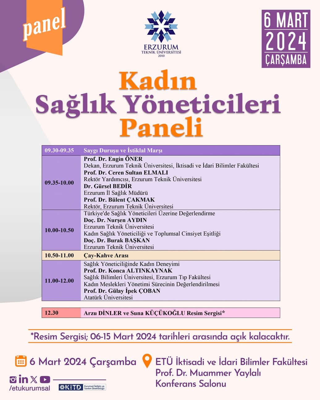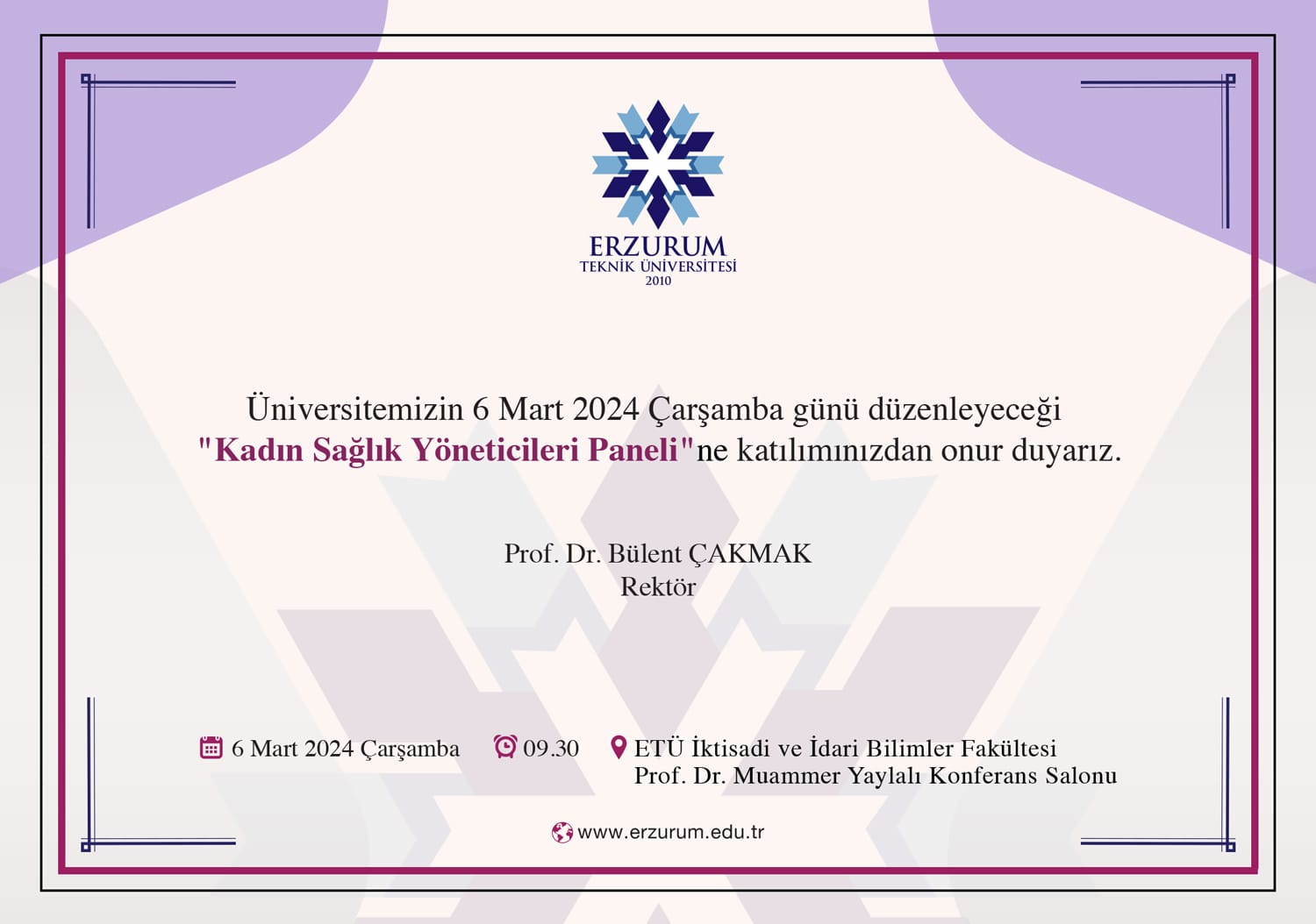 Üniversitemizin 6 Mart 2024 Çarşamba günü düzenleyeceği "Kadın Sağlık Yöneticileri Paneli" ile ilgili davet yazısı ve panel programı aşağıdaki gibidir.