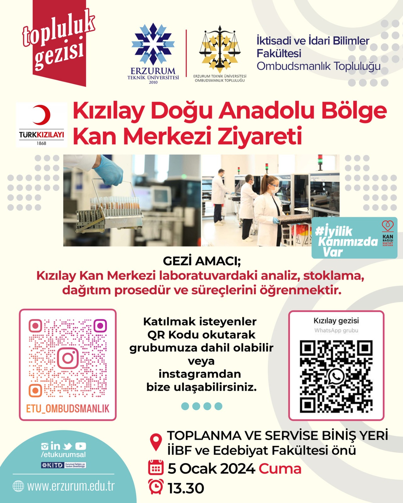 Fakültemiz bünyesinde kurulmuş olan ve akademik danışmanlığını İşletme Bölümü öğretim elemanı Sayın Arş. Gör. M. Asım KANTAR'ın yürüttüğü Ombudsmanlık Topluluğu, 05.01.2024 tarihinde gerçekleştirilen organizasyonla Doğu Anadolu Bölge Kan Merkezi'ni ziyaret etti.