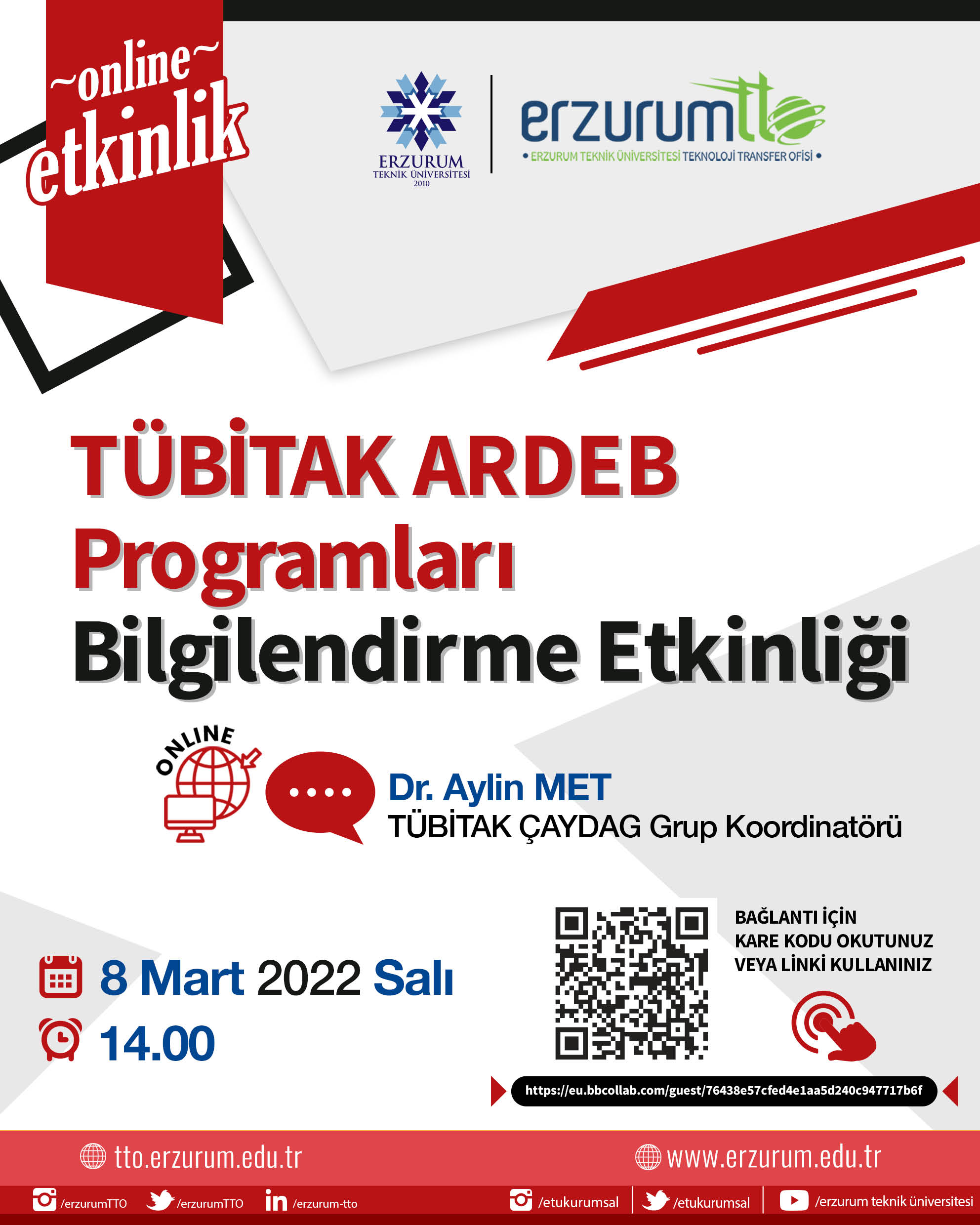 Erzurum TTO koordinatörlüğünde Üniversitemiz araştırmacılarına yönelik TÜBİTAK Çevre, Atmosfer, Yer ve Deniz Bilimleri Araştırma Destek Grubu (ÇAYDAG) Grup Koordinatörü Dr. Aylin MET'in konuşmacı olarak katılacağı "TÜBİTAK ARDEB Programları Bilgilendirme Etkinliği" çevrimiçi olarak 08 Mart 2022 Salı Günü Saat: 14.00'te başlayacaktır.